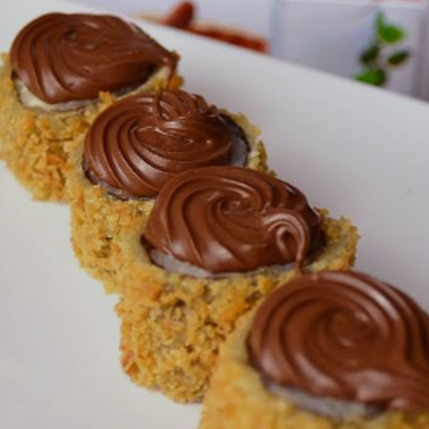 10 Hot recheado c Chocolate Serve uma pessoa Tem cerca de 1,5 Cm de Diametro e 1 Cm de Altura Pesa aproximadamente 21 G a unidade Não acompanha hashi e molho