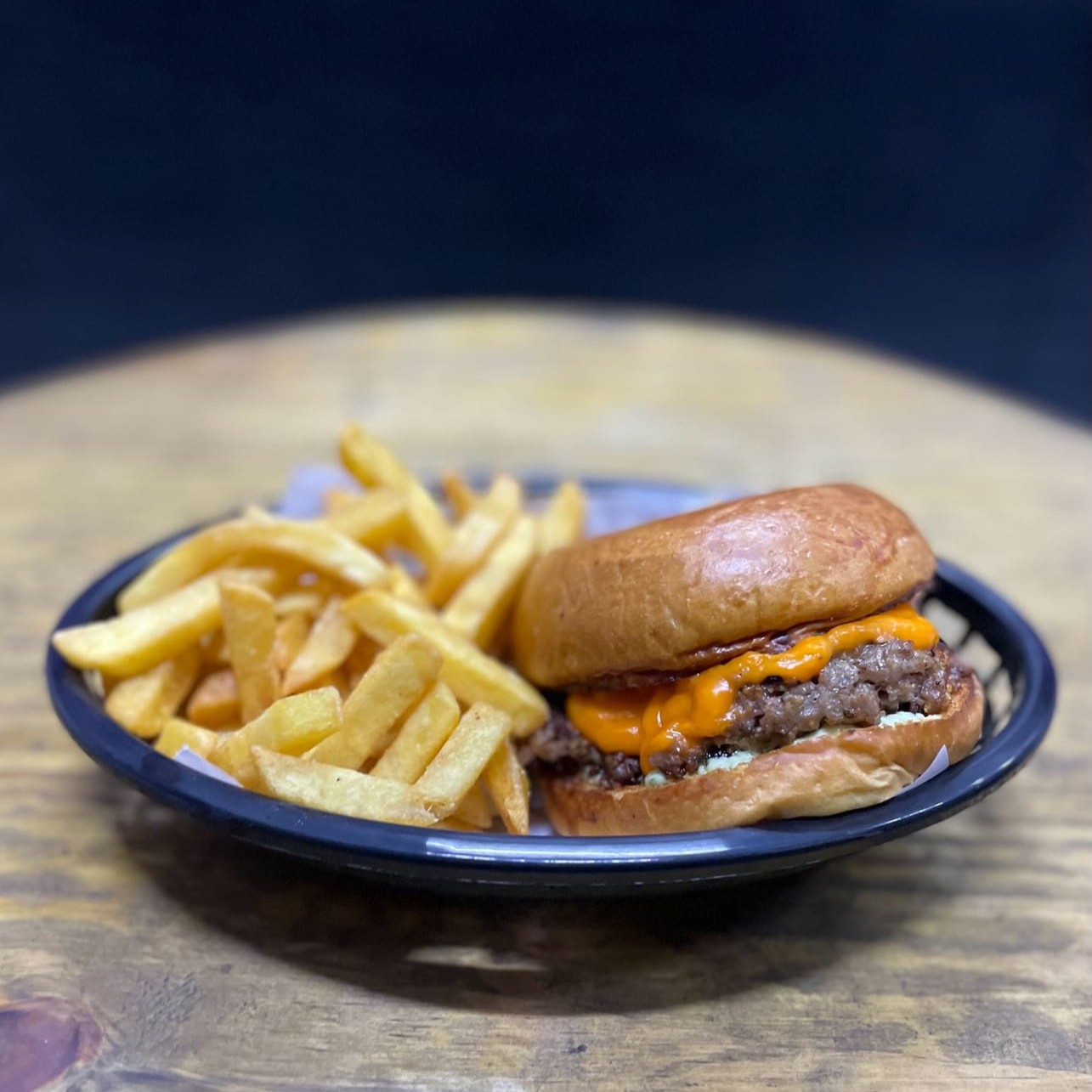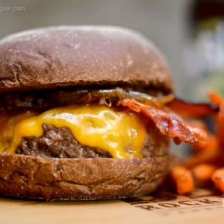 Hambúrguer de 150g, Queijo cheddar, Bacon, Maionese da casa bem temperada no pão de Brioche selado + batata frita