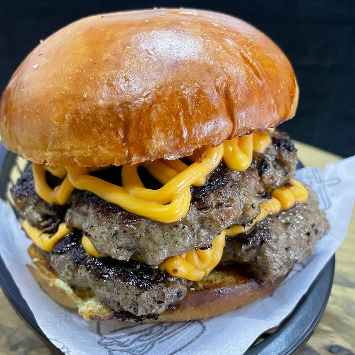 2 Hambúrgueres Artesanal de 150g, Queijo cheddar, Maionese da casa bem temperada no pão de Brioche selado.