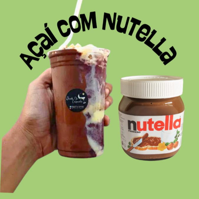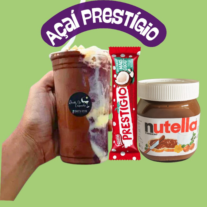 este delicioso açaí de 500ml é composto por um prestígio picado dentro do copo, acompanhado de uma generosa camada de nutella na lateral do copo. personalize como preferir., escolha até 4 acompanhamentos