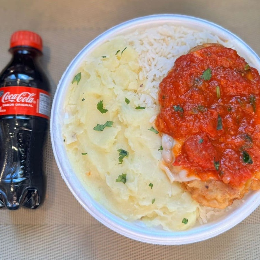 Marmita com delicioso filé de frango parmegiana (empanado na massa crocante coberto com molho de tomates e queijo) acompanhado de arroz branco e purê de batatas inglesas. Acompanha refrigerante pet Coca Cola bem gelado. Marmita indicada para 01 pessoa.