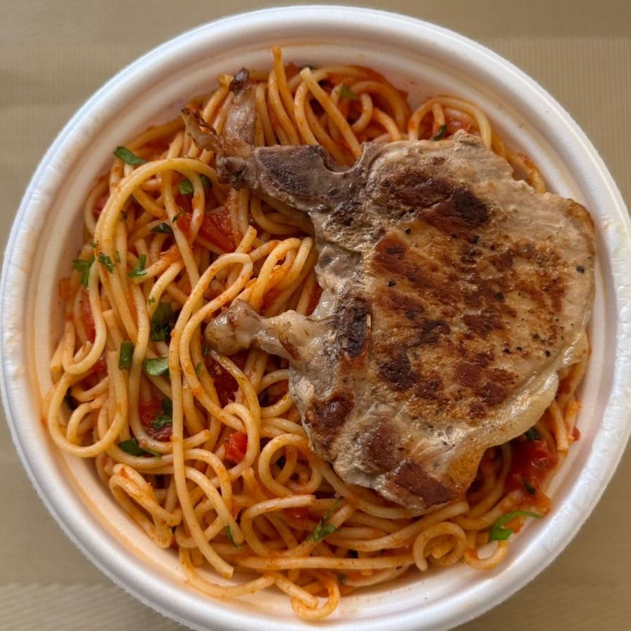 Marmita com deliciosa bisteca suína grelhada acompanhada de macarrão espaguete ao molho de tomates. Marmita indicada para 01 pessoa.