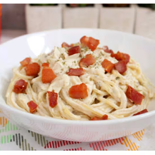 Um delicioso macarrão com bacon e molho branco e um toq de tempero caseiro iresetivel