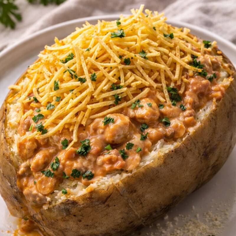 Batata Recheada De Strogonoff Com Batata Palha