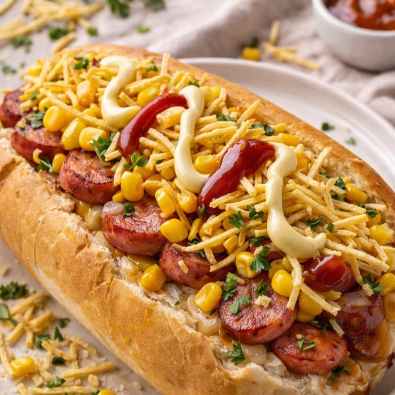 Um maravilhoso dogão recheado com salsicha carne moída presunto queijo batata palha maionese um maravilhoso dogão
