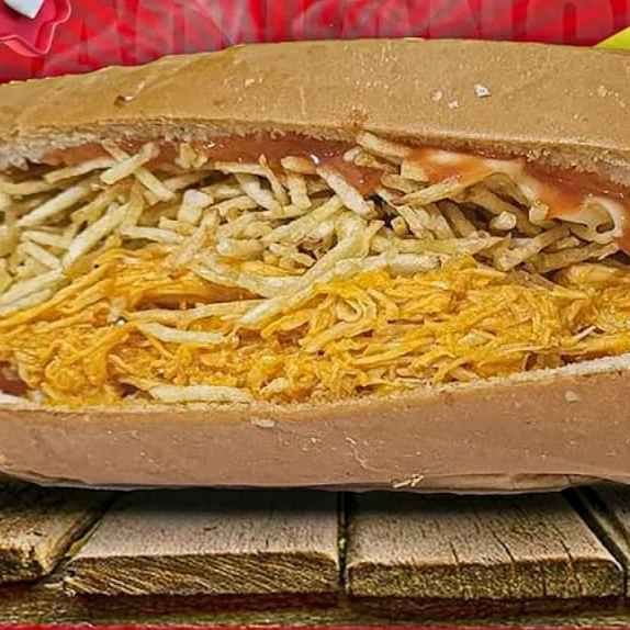 Um delicioso dogão recheado com calabresa queijo presunto maionese cheddar batata palha e duas salsicha uma explosão de sabor