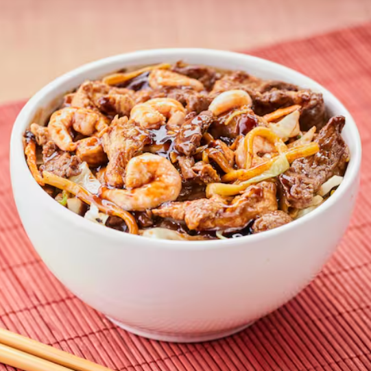 Macarrão yakisoba frito com carne, frango, camarão, presunto e mix de legumes ao molho shoyu. Finalizado com especiarias orientais e óleo de gergelim torrado.