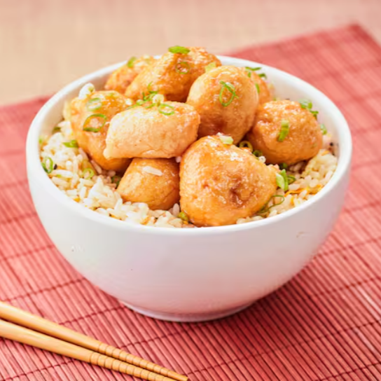 Bolinhas de Frango crocantes, mergulhadas em um irresistível molho a sua escolha! Acompanhadas do nosso yakimeshi, um arroz que traz flocos de ovos, cenoura e cebolinha.