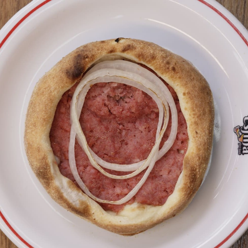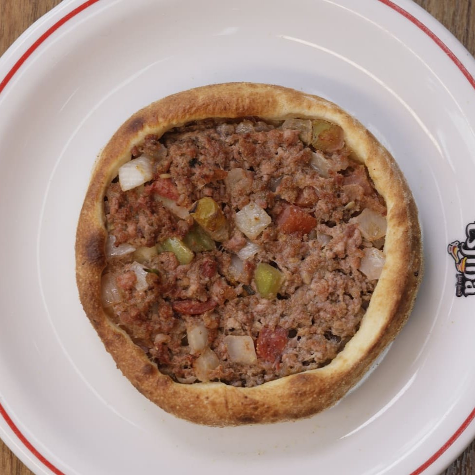 Carne moída, mussarela, ovo, calabresa moída e bacon frito
