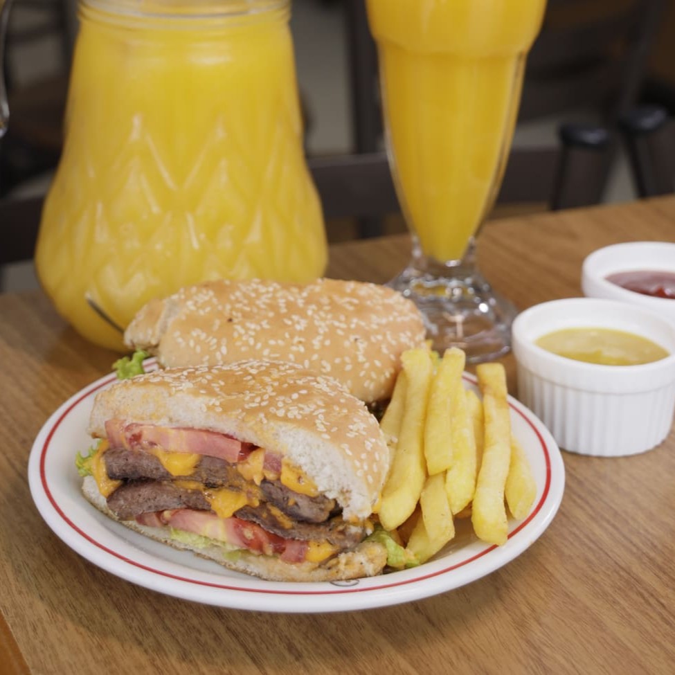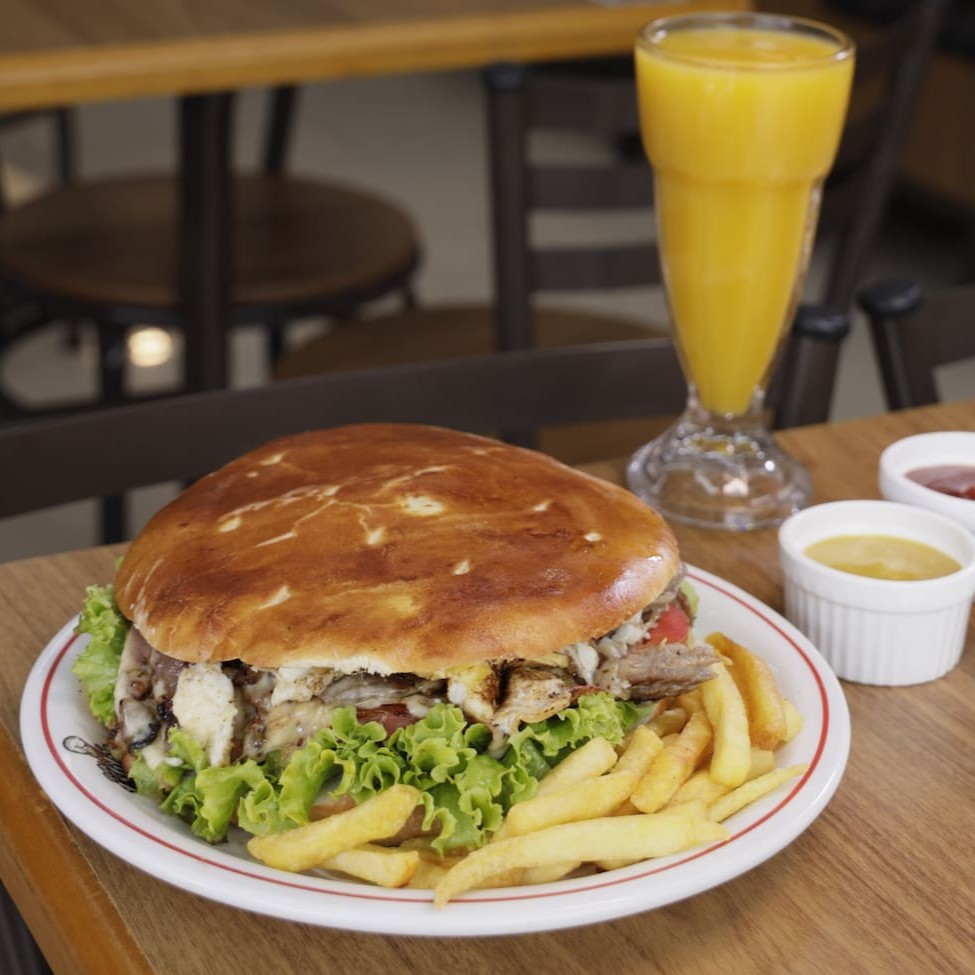 Hambúrguer, mussarela, ovo, bacon frito, presunto, calabresa, salada e maionese