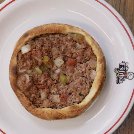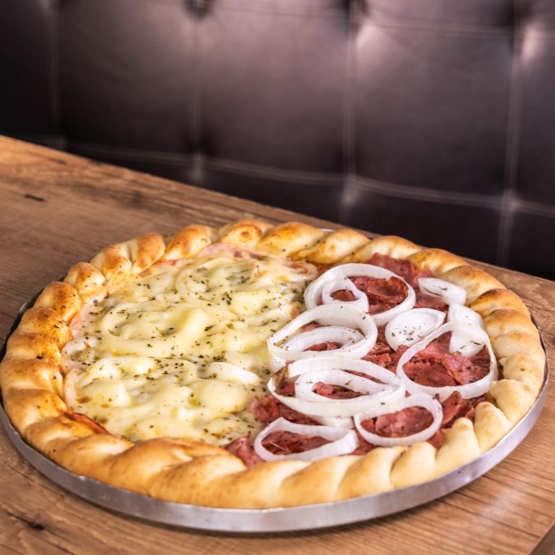 Carne moída, mussarela, calabresa moída e bacon rito