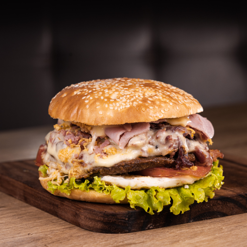 Hambúrguer, mussarela, ovo, bacon frito, presunto, calabresa, salada e maionese