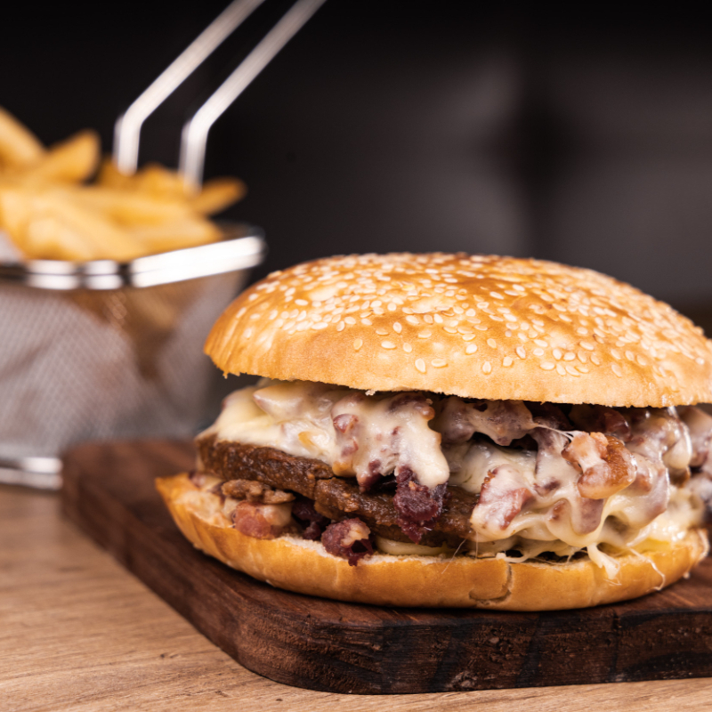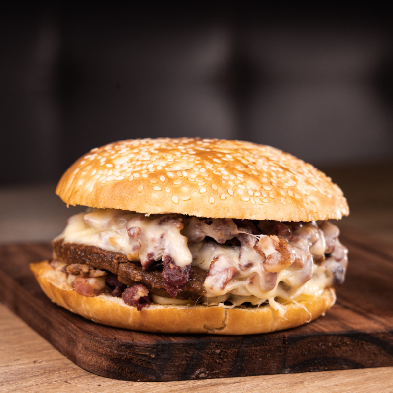 Hambúrguer, mussarela, bacon frito e maionese