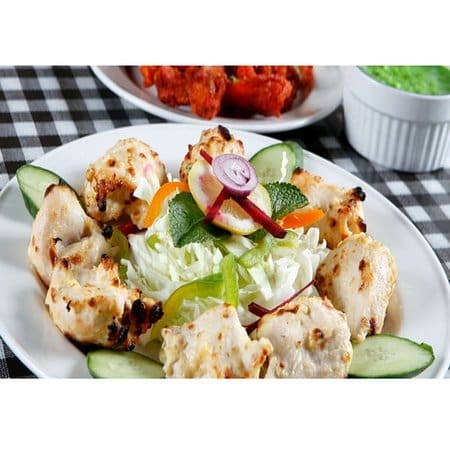 Namaste murgh malai kebab, frango cremoso com creme de queijo, coentro e mistura de especiarias indianas ao forno tandoor.