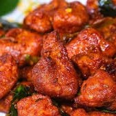 Cubos de frango com batatas, molho mais grosso e mais picante.