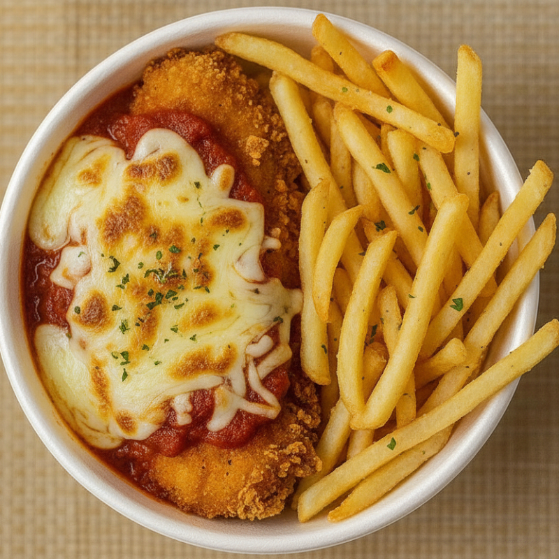 Parmegiana de com fritas + coca 200ml grátis.