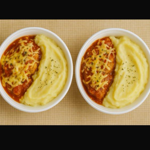 2 Parmegianas de frango ao molho sugo, acompanha arroz, feijão e purê de batatas.