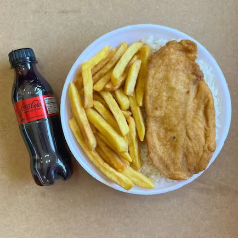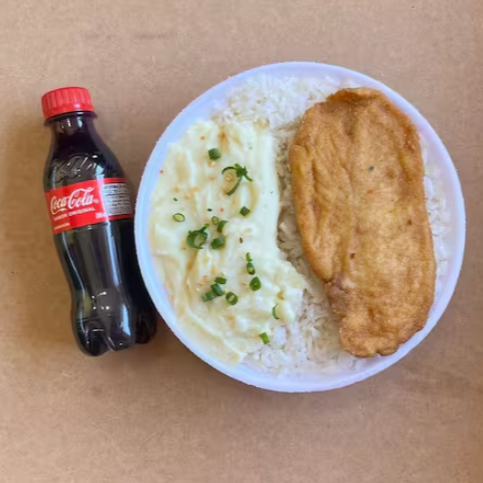 Marmita com delicioso filé de frango empanado na massa crocante acompanhado de arroz branco, feijão e purê de batatas inglesas. Acompanha refrigerante pet Coca Cola bem gelado. Marmita indicada para 01 pessoa.