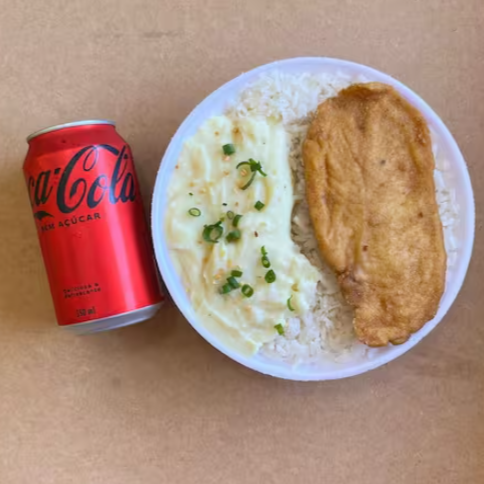 Marmita com delicioso filé de frango empanado na massa crocante acompanhado de arroz branco, feijão e purê de batatas inglesas. Acompanha refrigerante Coca Cola lata Zero sem açúcar 350ml bem gelada. Marmita indicada para 01 pessoa.