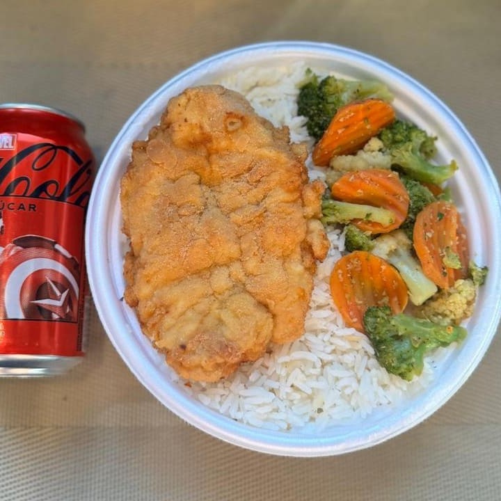 Marmita com delicioso filé de frango empanado na massa crocante acompanhado de arroz branco, feijão e mix de legumes. Acompanha refrigerante Coca Cola lata Zero sem açúcar 350ml bem gelada. Marmita indicada para 01 pessoa.