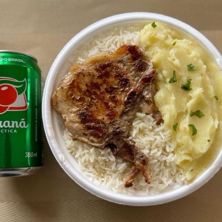 Marmita com deliciosa bisteca suína preparada com arroz branco, feijão e purê de batata inglesa. Acompanha refrigerante lata Guaraná Antárctica lata 350ml bem gelada. Marmita indicada para 01 pessoa.