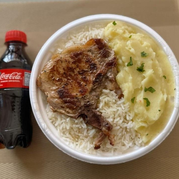 Marmita com deliciosa bisteca suína preparada com arroz branco, feijão e purê de batata inglesa. Acompanha refrigerante pet Coca Cola bem gelada. Marmita indicada para 01 pessoa.