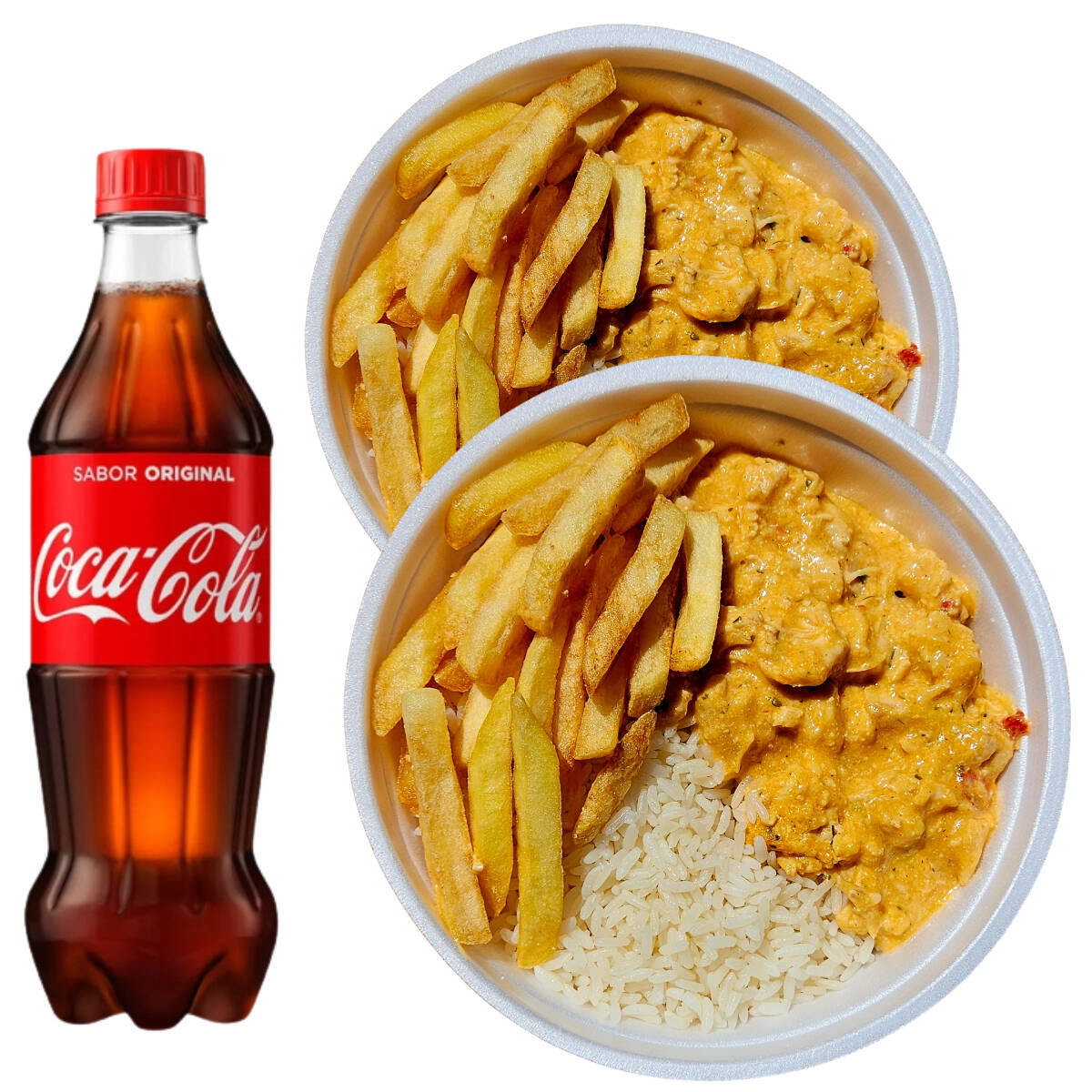 Leve um strognoff de frango, com arroz e batata palha + coca cola 220ml grátis.