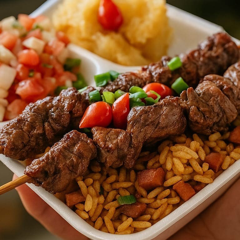 Prato tradicional de fim de tarde dos paulistano, servido com arroz de baião de dois, mandioca cozida e frita na manteiga e vinagrete, acompanhado de 2 espetinhos a sua escolha.