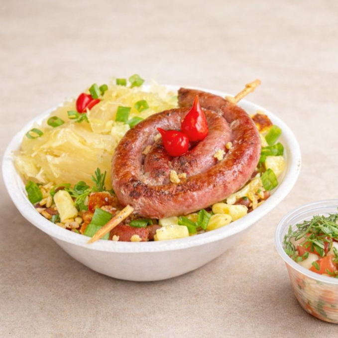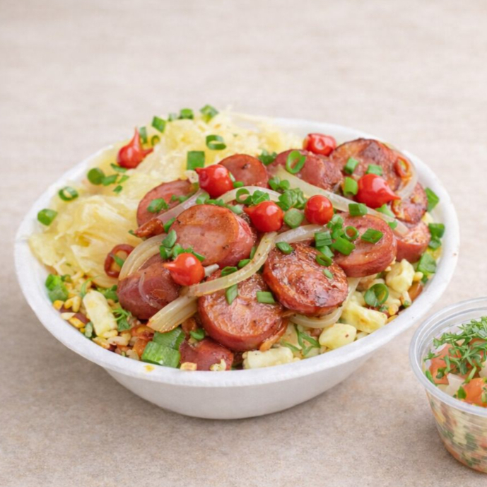 Nosso Delicioso Baião De Dois, É Feito Com Linguiça Defumada sadia, Cebola, Arroz, Feijão De Corda Legitimo, queijo coalho, Regado Com Manteiga De Garrafa Pra Deixar Aquele Sabor Inconfudivel, Tempero Baiano, Coloral E Salsinha. Acompanha Mandioca Frita Na Manteiga E Vinagrete, e rodelas de calabresa acebolada. Finalizado Com Cebolinha, Pimenta Biquinho e alho frito.