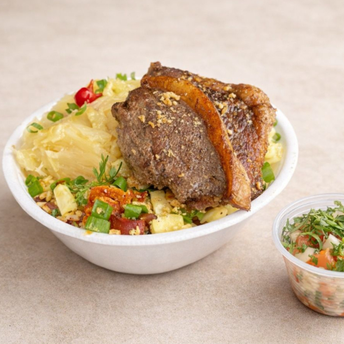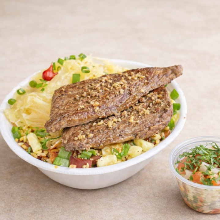 Nosso Delicioso Baião De Dois, É Feito Com Linguiça Defumada, Cebola, Arroz, Feijão De Corda Legitimo, queijo coalho, Regado Com Manteiga De Garrafa Pra Deixar Aquele Sabor Inconfudivel, Tempero Baiano, Coloral E Salsinha. Acompanha Mandioca Frita Na Manteiga E Vinagrete e bife de contra file, Finalizado Com Cebolinha E Pimenta Biquinho.