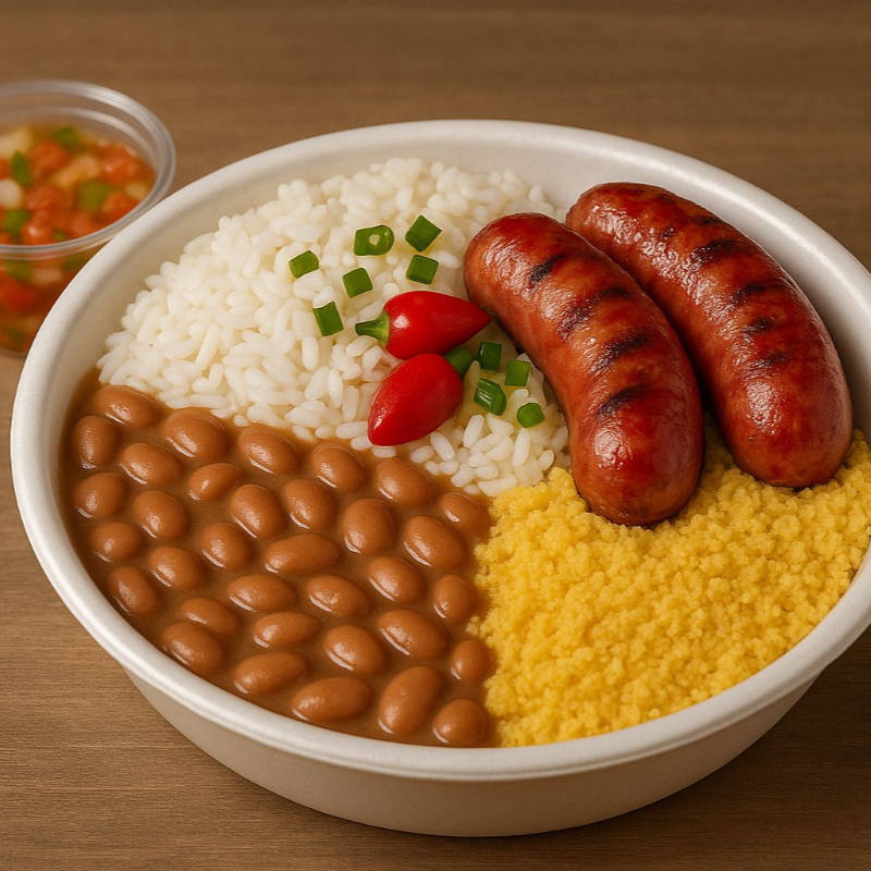Nosso Delicioso Baião De Dois, É Feito Com Linguiça Defumada, Cebola, Arroz, Feijão De Corda Legitimo, queijo coalho, Regado Com Manteiga De Garrafa Pra Deixar Aquele Sabor Inconfudivel, Tempero Baiano, Coloral E Salsinha. Acompanha Mandioca Frita Na Manteiga E Vinagrete e linguiça de costela bovina maturatta, Finalizado Com Cebolinha E Pimenta Biquinho.