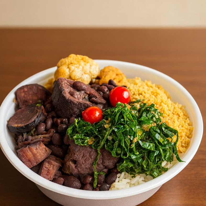DELICIOSA FEIJOADA COM CARNES SELECIONADAS, ARROZ, FEIJÃO FRESQUINHO, COUVE, TORRESMOS E FAROFA