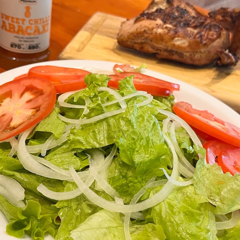 Salada de alface, tomate e cebola acompanhada de 1/4 de galeto