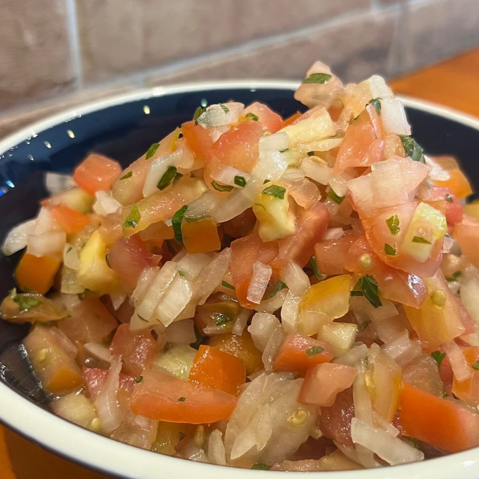 Salada de alface, tomate e cebola acompanhada de dois espetos tradicionais