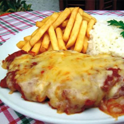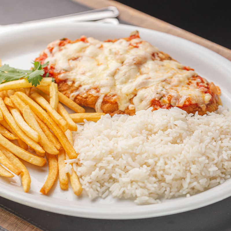 Filé de frango empanado coberto com molho de tomate mussarela caupiry cheddar e parmesão. Acompanha arroz, batata frita ou purê ou ovo frito ou milho na manteiga