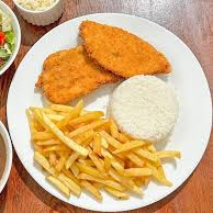 Frango a milanesa. Acompanha Arroz, Batata frita ou mix de legumes ou ovo frito