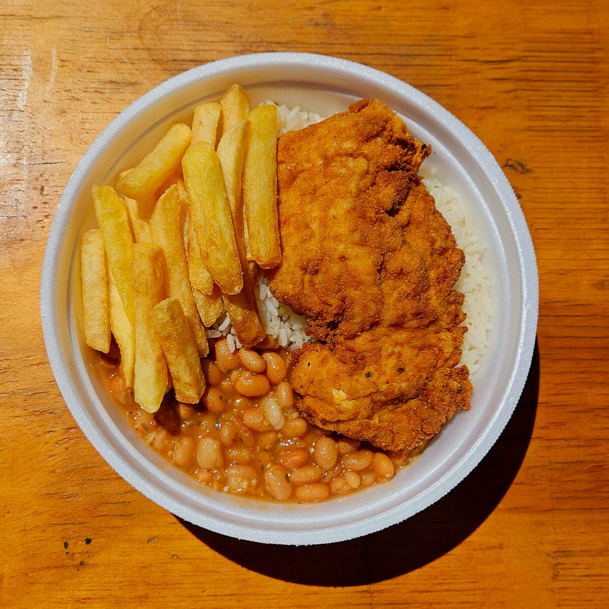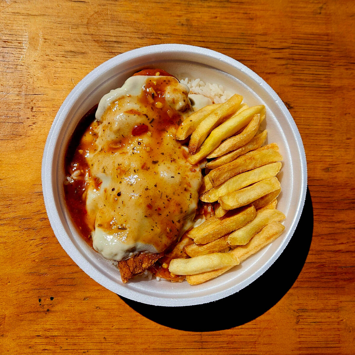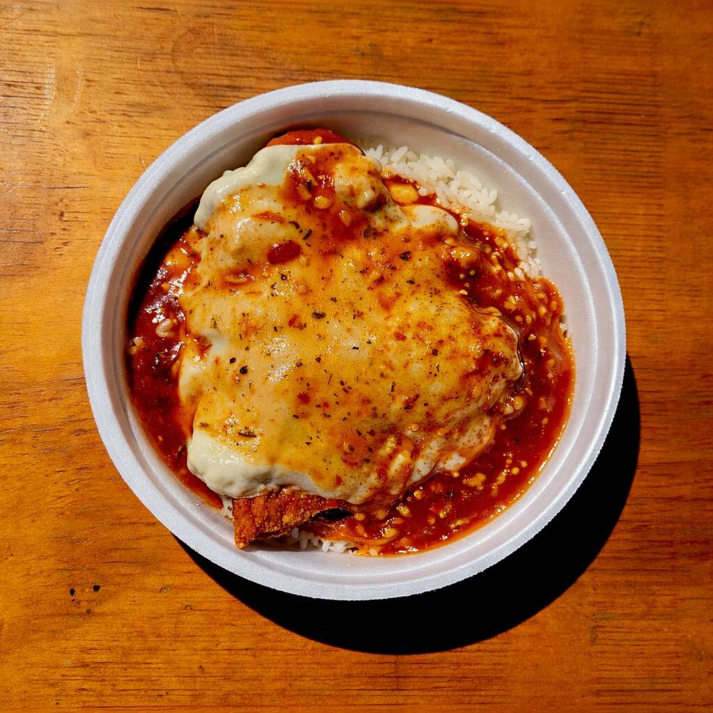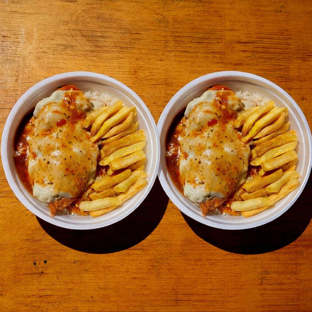 Filé de frango empanado e crocante, coberto com molho de tomate e queijo gratinado. Acompanha arroz branco e batata frita.