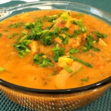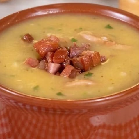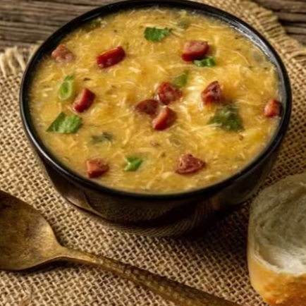 Caldo de kenga frango desfiado cenoura mandioca e mandioquinha acompanha pão francês