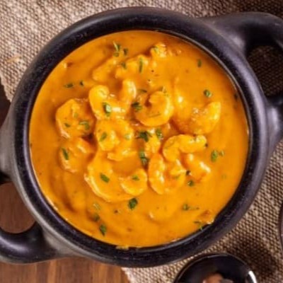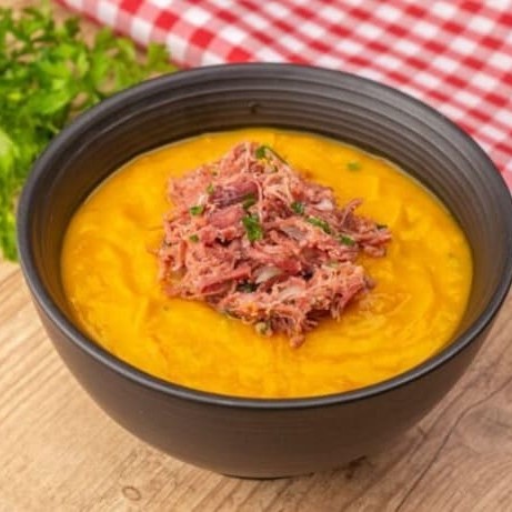 Caldo abobora com carne seca requeijão e cenoura acompanha pão francês 495g