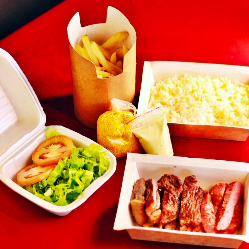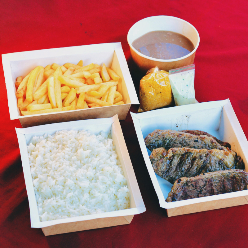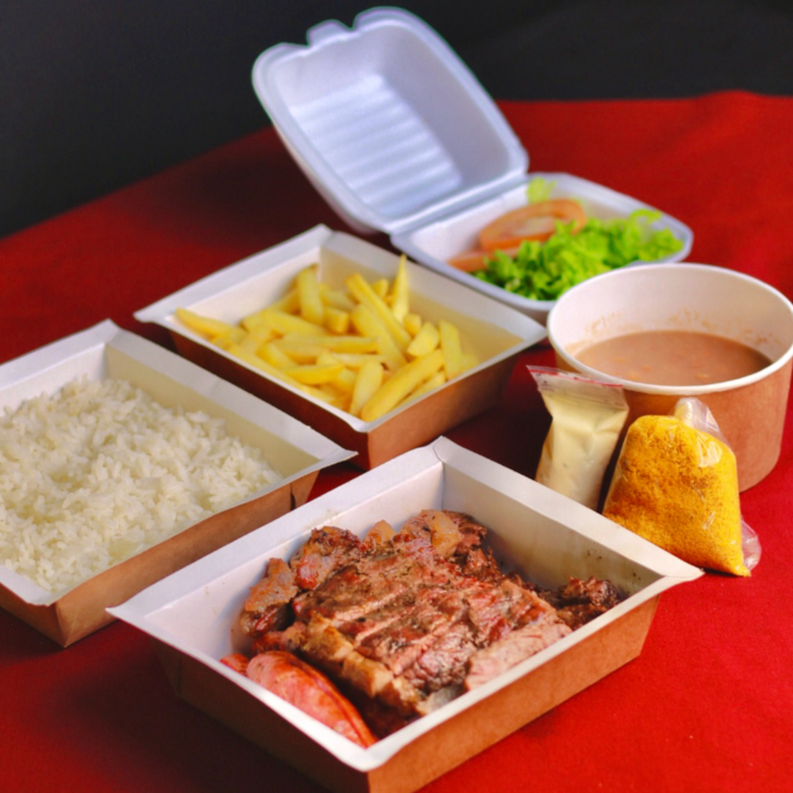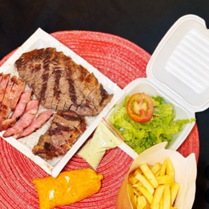 Padrão 2 Pessoa: Arroz, Feijão, Batata Frita, Contra File, Linguiça, Farofa, Molhinho Verde e Salada.