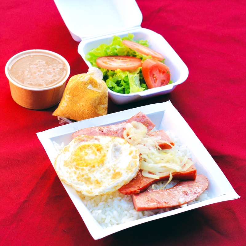 arroz 200 gramas, 180ml de feijão, calabresa com ovo, salada e farofa.