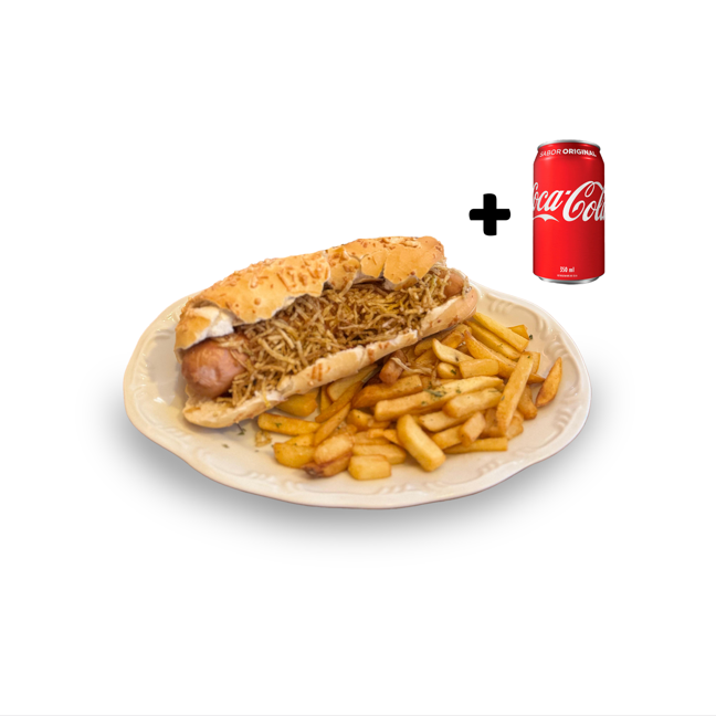 Baguete, Salsicha Alemã, Ketchup de Curry. Acompanha: Batata Frita e Refrigerante.