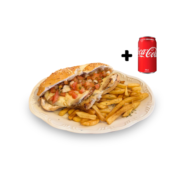 Baguete, Frango Grelhado, Queijo, Vinagrete. Acompanha: Batata Frita e Refrigerante.