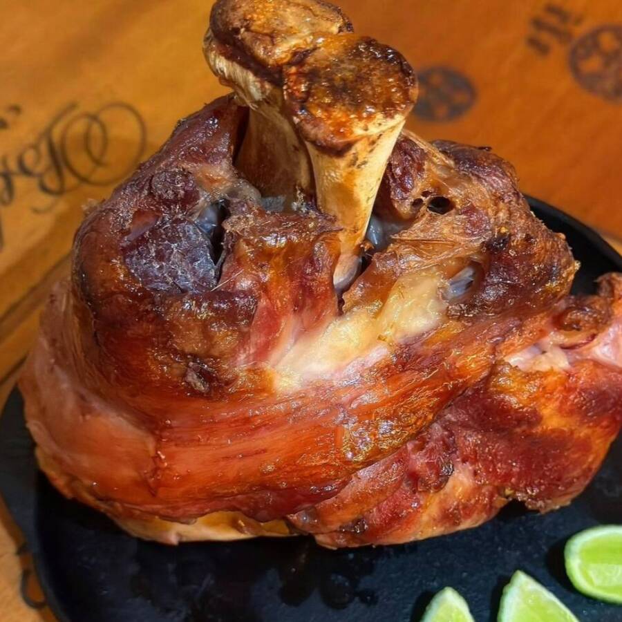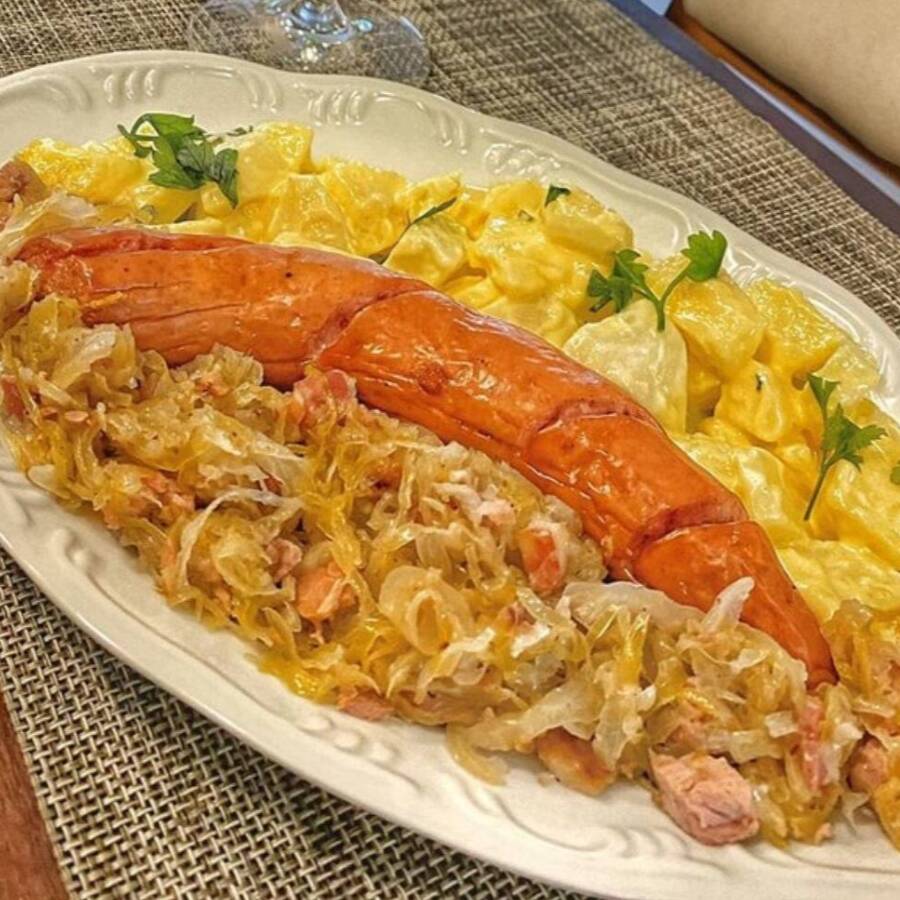 Acompanha: Chucrute (Repolho Fermentado), Batata Alemã com Mostarda e Salada.