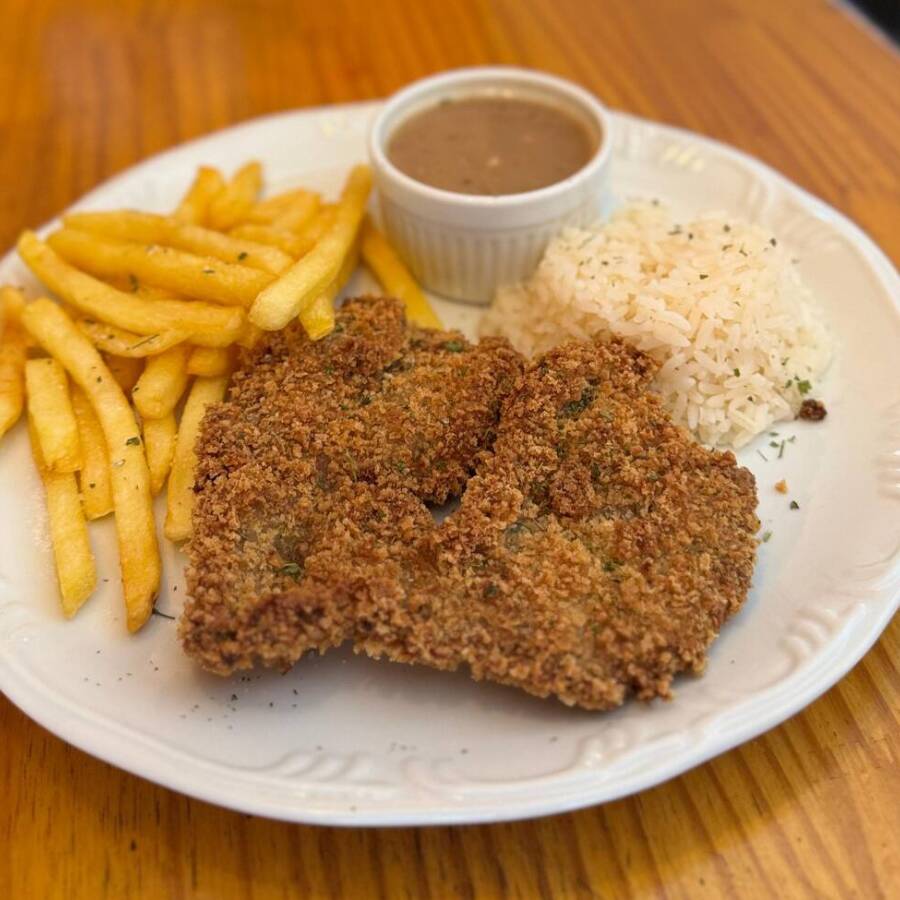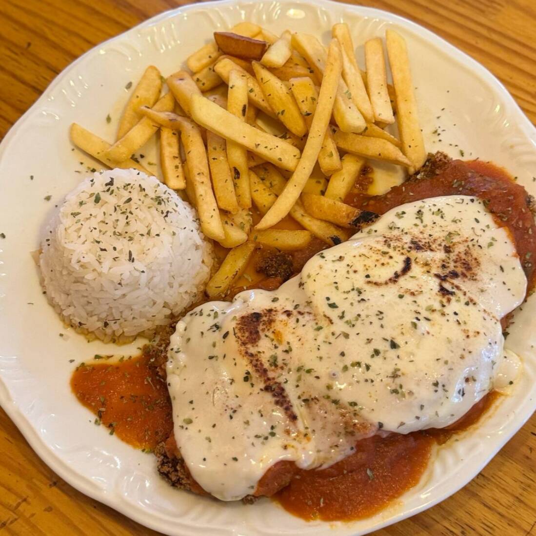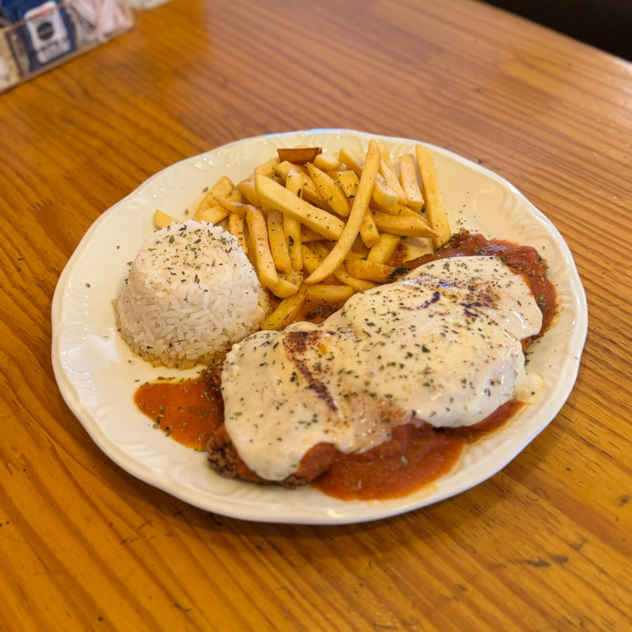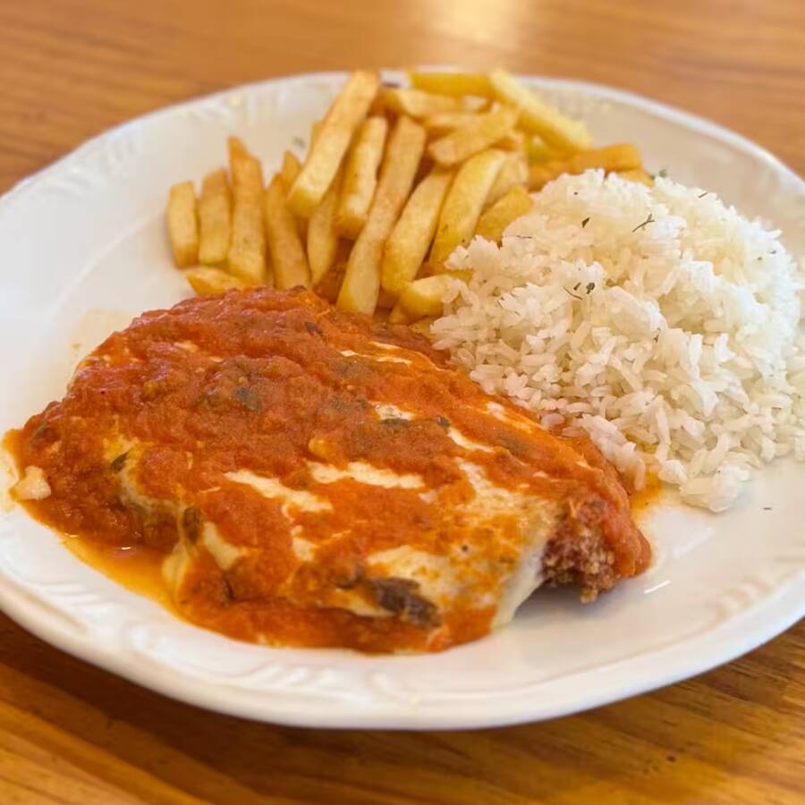 Lombo de Porco Empanado e Crocante à Parmegiana. Acompanha: Arroz e Fritas.