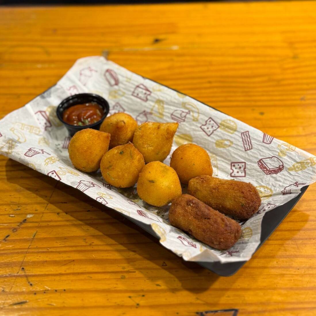 Coxinha de Frango c/ Requeijão, Coxinha de Costelinha c/ Barbecue, Bolinha de Mandioquinha c/ Provolone e Croqueta de Porco. (2 unidades de cada).
