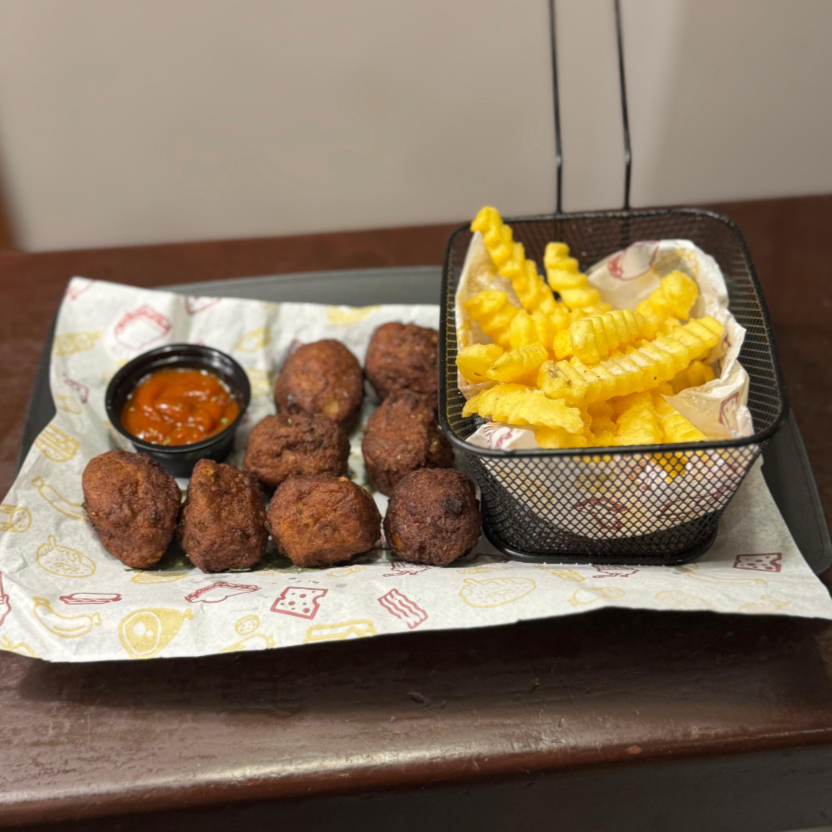 8 Bolinhos Alemão Suíno e Bovino com Especiarias + Fritas.