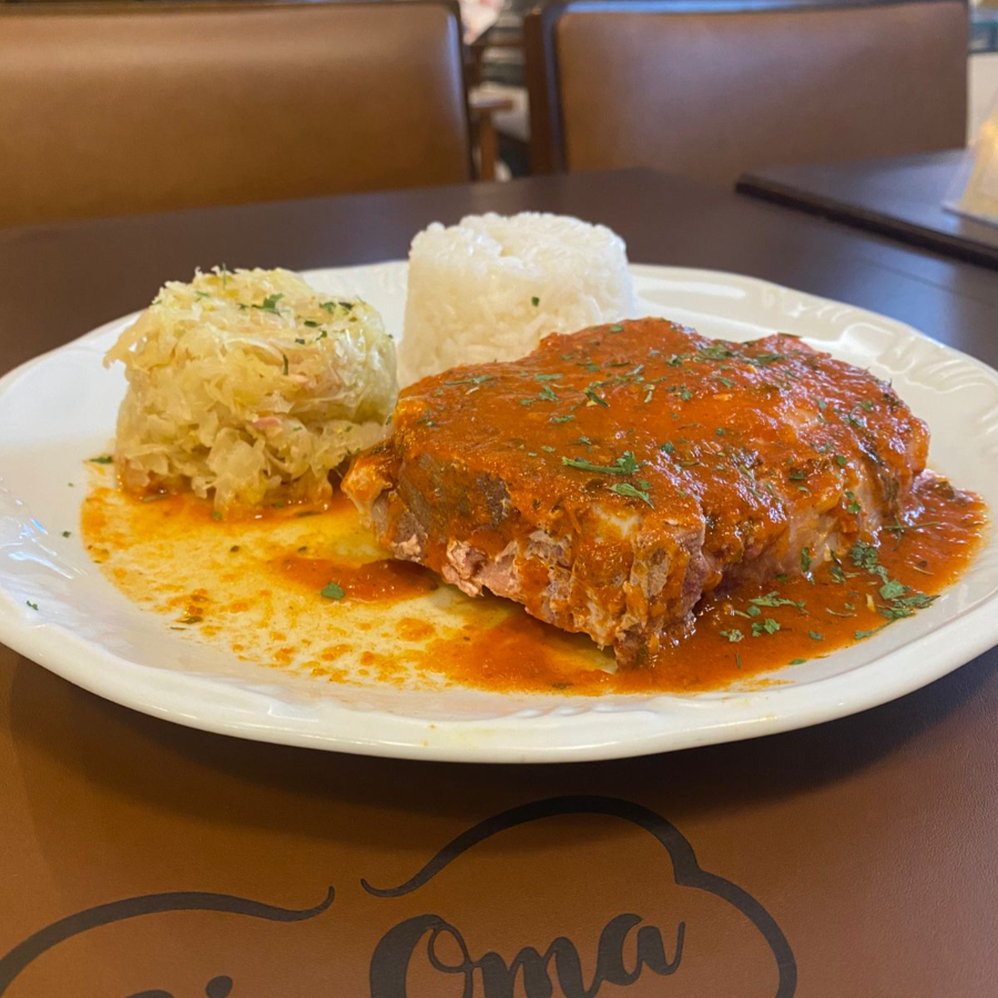 Carré Suíno com Molho de Paprika. Acompanha: Arroz e Chucrute.
