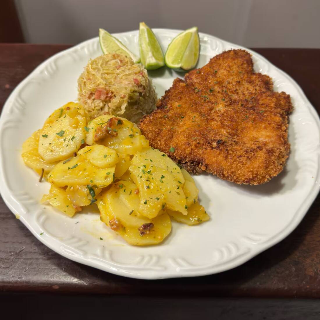 Lombo de Porco Empanado e Crocante c/ Limão. Acompanha: Chucrute e Salada de Batata.