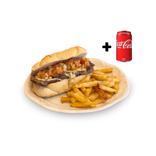 Baguete, Filé Mignon, Queijo, Vinagrete. Acompanha: Batata Frita e Refrigerante